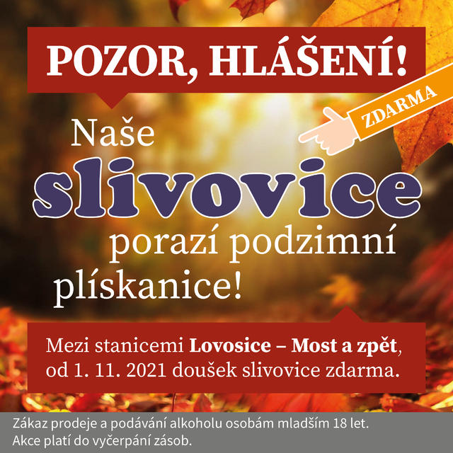 Vážení cestující, protože Vám chceme v pracovní dny zpříjemnit cestování mezi železničními stanicemi Lovosice – Most a zpět, nabízíme Vám od 1. listopadu 2021 zdarma doušek naší slivovice.