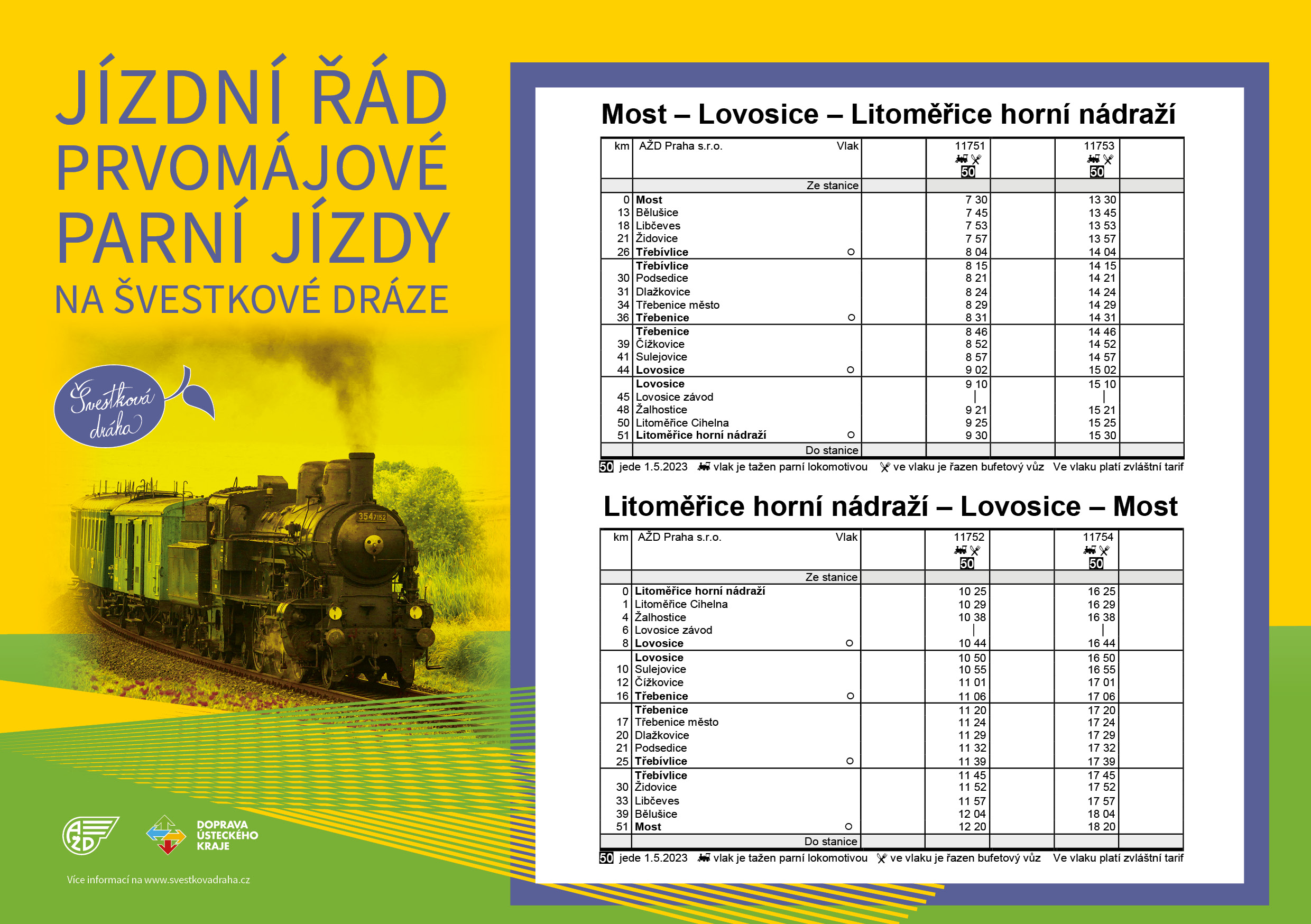 Pro všechny, kteří chtějí První máj oslavit netradičně s vůní páry, připravila Švestková dráha (Linka U10: Litoměřice horní nádraží – Lovosice – Most) nostalgické parní jízdy. Společnost AŽD v první májový den vypraví historickou soupravu taženou parní lokomotivou 354.195, které se přezdívá Všudybylka.